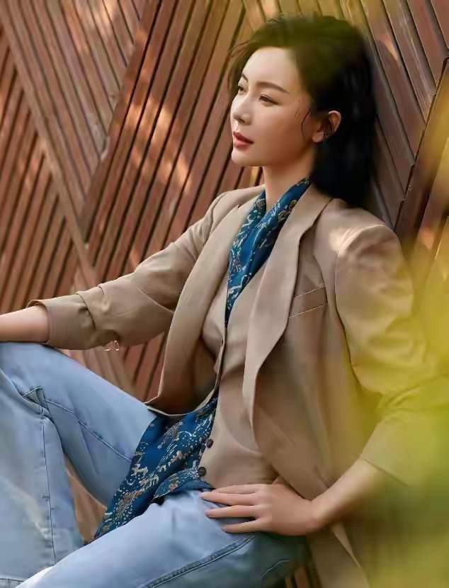 比如上面卡其色的西装外套,内搭同色系马甲,加上一条牛仔裤,面料有光泽,挺阔有型,加上休闲的牛仔裤,使得穿搭者通勤时髦。