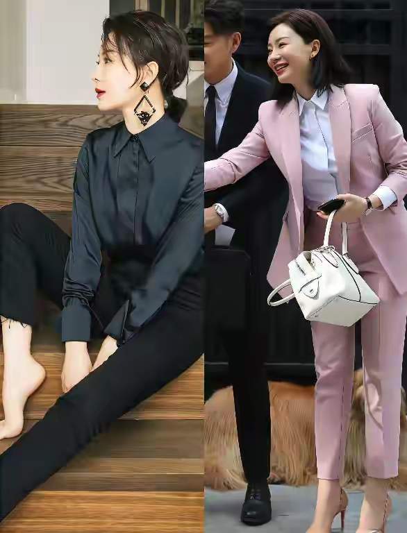 担心自己搭配出错选择套装最简单,比如上面这种浅粉色的西服套装,搭配上浅口的高跟鞋,内搭一件衬衫,轻松提升气质。